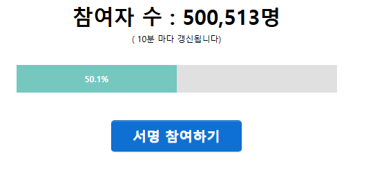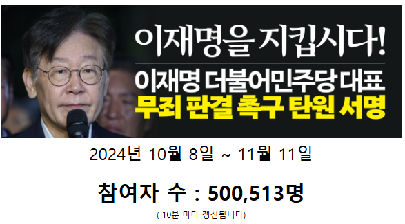 이재명 대표의 무죄탄원 서명은 11월 6일 10시 기준 약 50만명이 넘는 인원이 서명에 참여하였습니다.