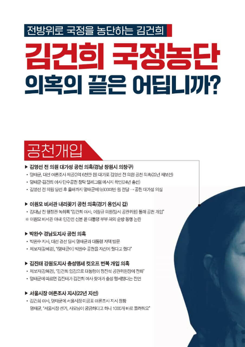 김 여사가 특정 인사들의 공천에 개입했다는 주장이 지속적으로 제기되고 있습니다. 대표적으로 김영선 전 의원 공천 의혹, 이원모 비서관 자리 내리꽂기 등의 의혹이 있으며, 이와 관련하여 더불어민주당은 국민의힘 인사 과정에 김 여사가 깊숙이 개입했다는 주장을 제기하고 있습니다. 국민들은 이러한 비리 의혹을 해결하기 위해 김건희 특검 천만인 서명운동에 참여하고 있습니다.