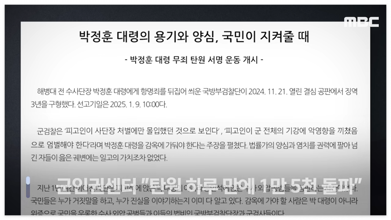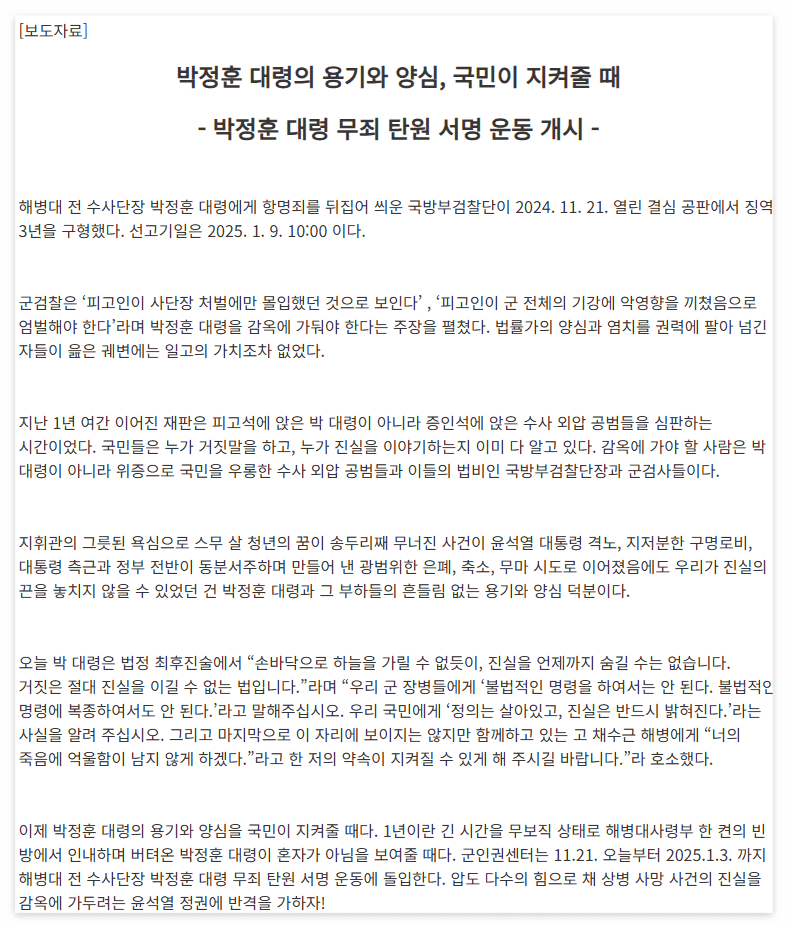2024년 11월 21일, 박정훈 대령의 무죄를 요구하는 온라인 탄원 서명 운동이 공식적으로 시작되었습니다.